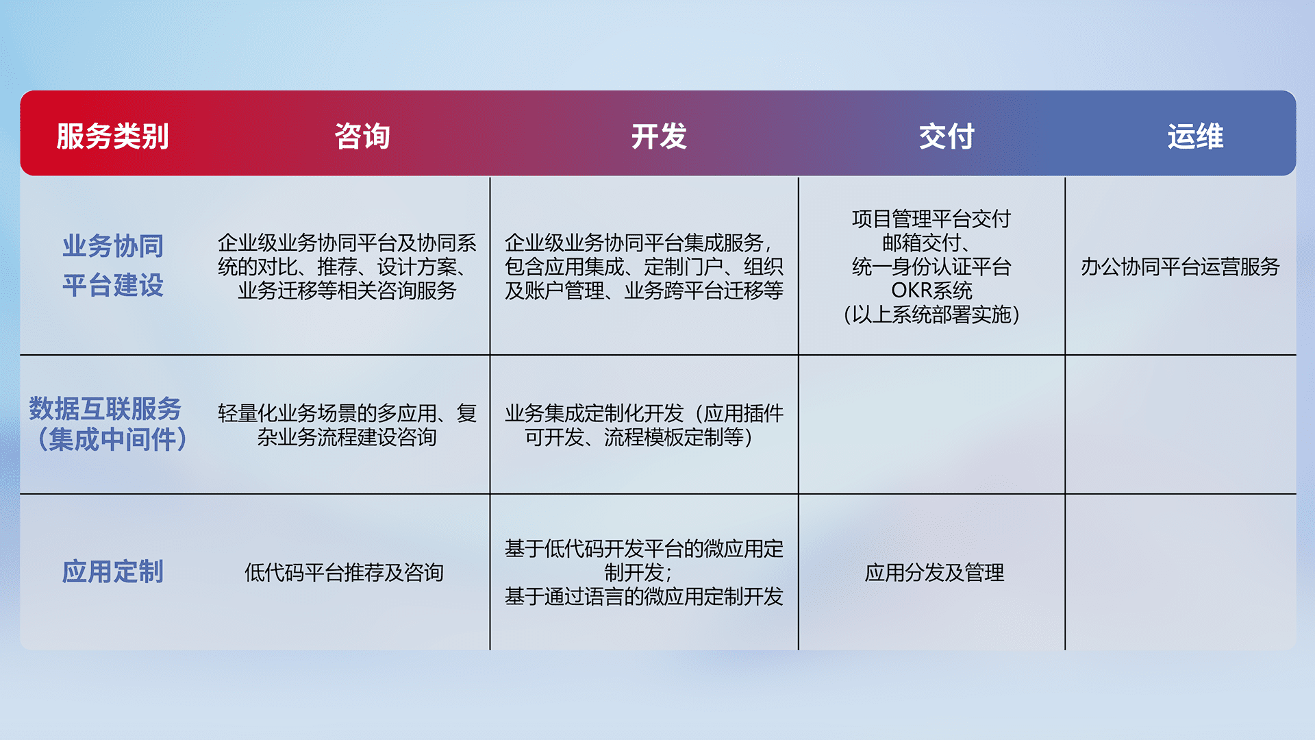 针对钉钉、、、企微、、、IDaas等平台级产品提供产品的规划、、、方案、、、交付、、定制化开发等服务,,,,实现如统一协同办公、、智能客户服务、、、、混合会议管理、、智能数据查询、、、、等业务场景,,实现数字化转型。。。。